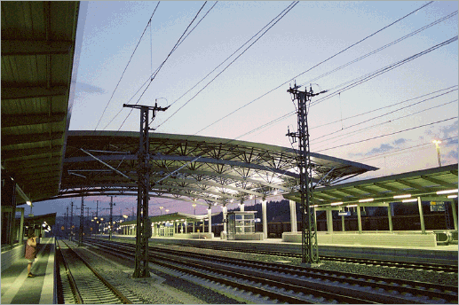 neues Bahnsteigdach vor altem Empfangsgebäude